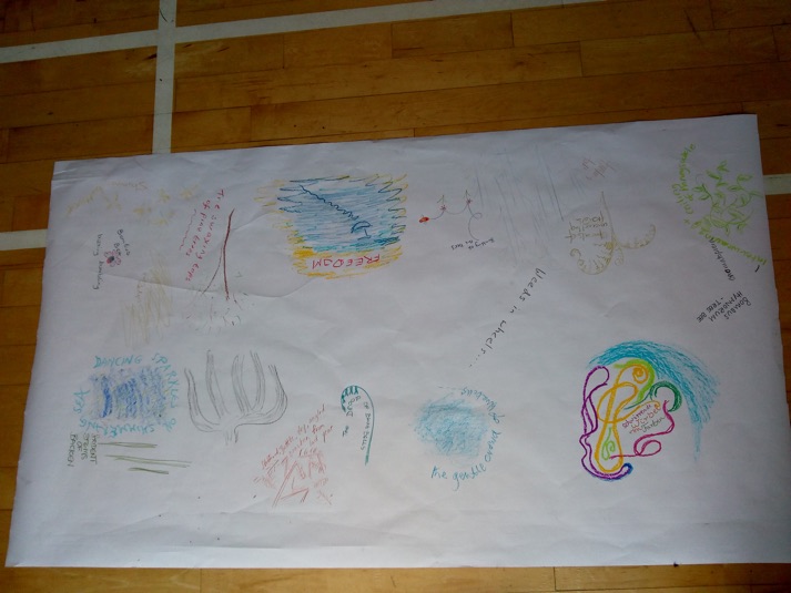 Wieder zurück in der schlichten Dorfhalle lassen wir unsere Eindrücke durch gemeinsame Bewegung (eine schlichte, einmalige Choreographie nur an diesem Tag) in unsere eigenes, individuelles Kunstwerk der einen oder anderen Art fließen. Wendy und die Teilnehmer, die mit dem eigenen Auto anreisen, bringen dazu Material mit, Du brauchst also nichts in Dein Handgepäck quetschen ;) Dein eigenes Werk nimmst Du mit nach Hause.